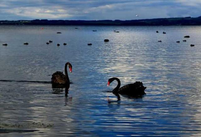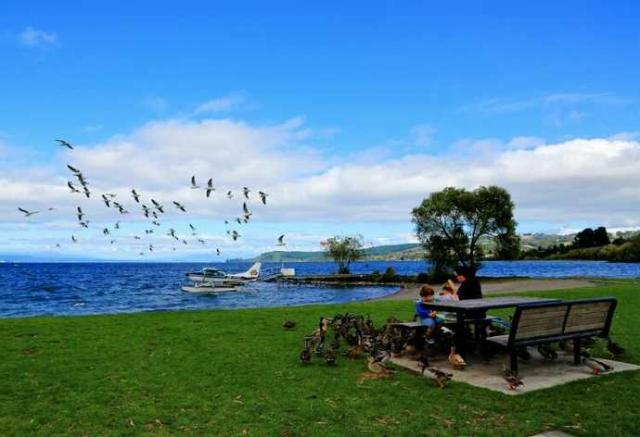 罗托鲁亚湖。湖面上很多形态动人的黑天鹅、活泼嬉戏的水鸭和雪白娇人的海鸥。