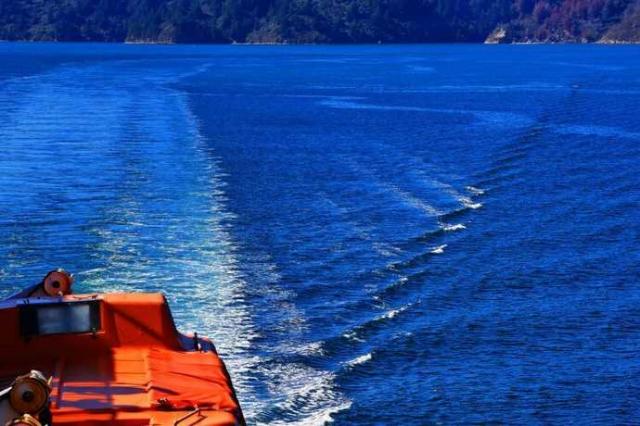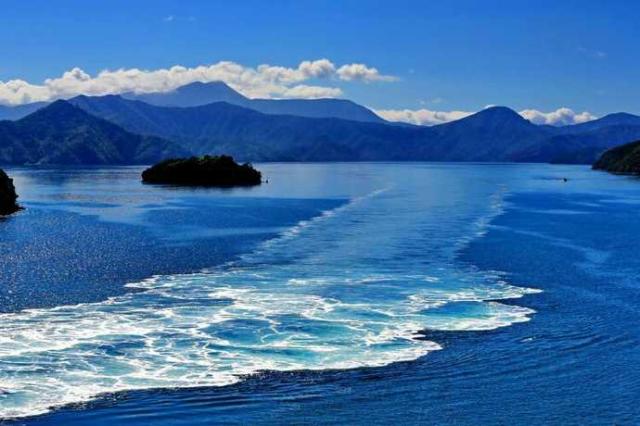乘坐渡轮横渡库克海峡,从北岛驶向南岛,整个航行历时3个小时。渡轮泛起的水纹韵律壮观。