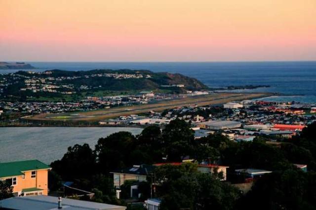 从维多利亚山远眺,威灵顿机场的跑道清澈可见,跑道就像铺设在海面上。