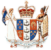 新西兰国徽的中心图案为盾徽。盾面上有五组图案;四颗五角星代表南十字星座,象征新西兰;麦捆代表农业;羊代表该国发达的畜牧业;交叉的斧头象征该国的工业和矿业;三只扬帆的船表示该国海上贸易的重要性。盾徽右侧为手持武器的毛利人,左侧是持有国旗的欧洲移民妇女;上方有一顶英国伊丽莎白女王二世加冕典礼时用的王冠,象征英国女王也是新西兰的国家元首;下方为新西兰蕨类植物,绶带上用英文写着新西兰