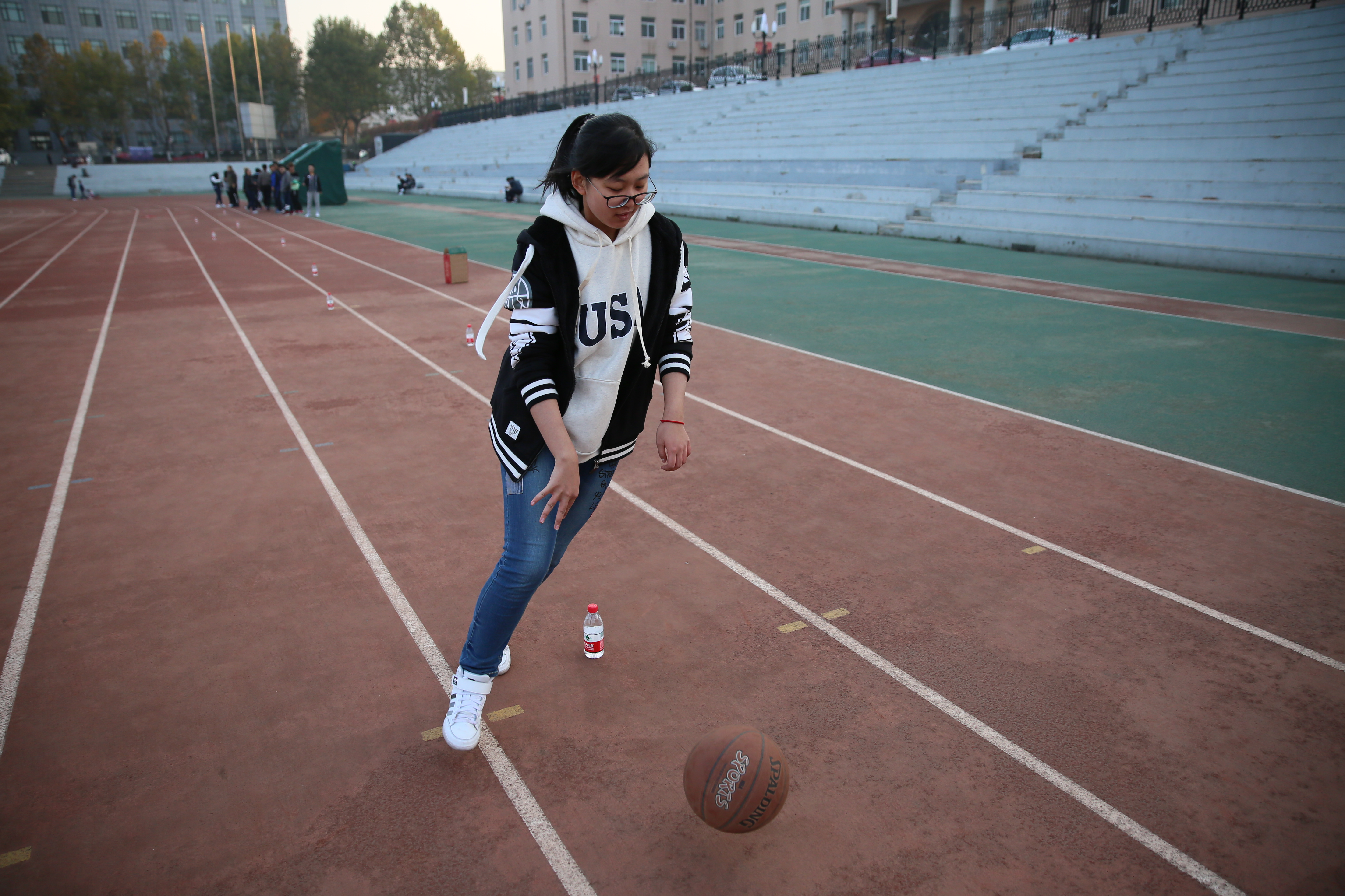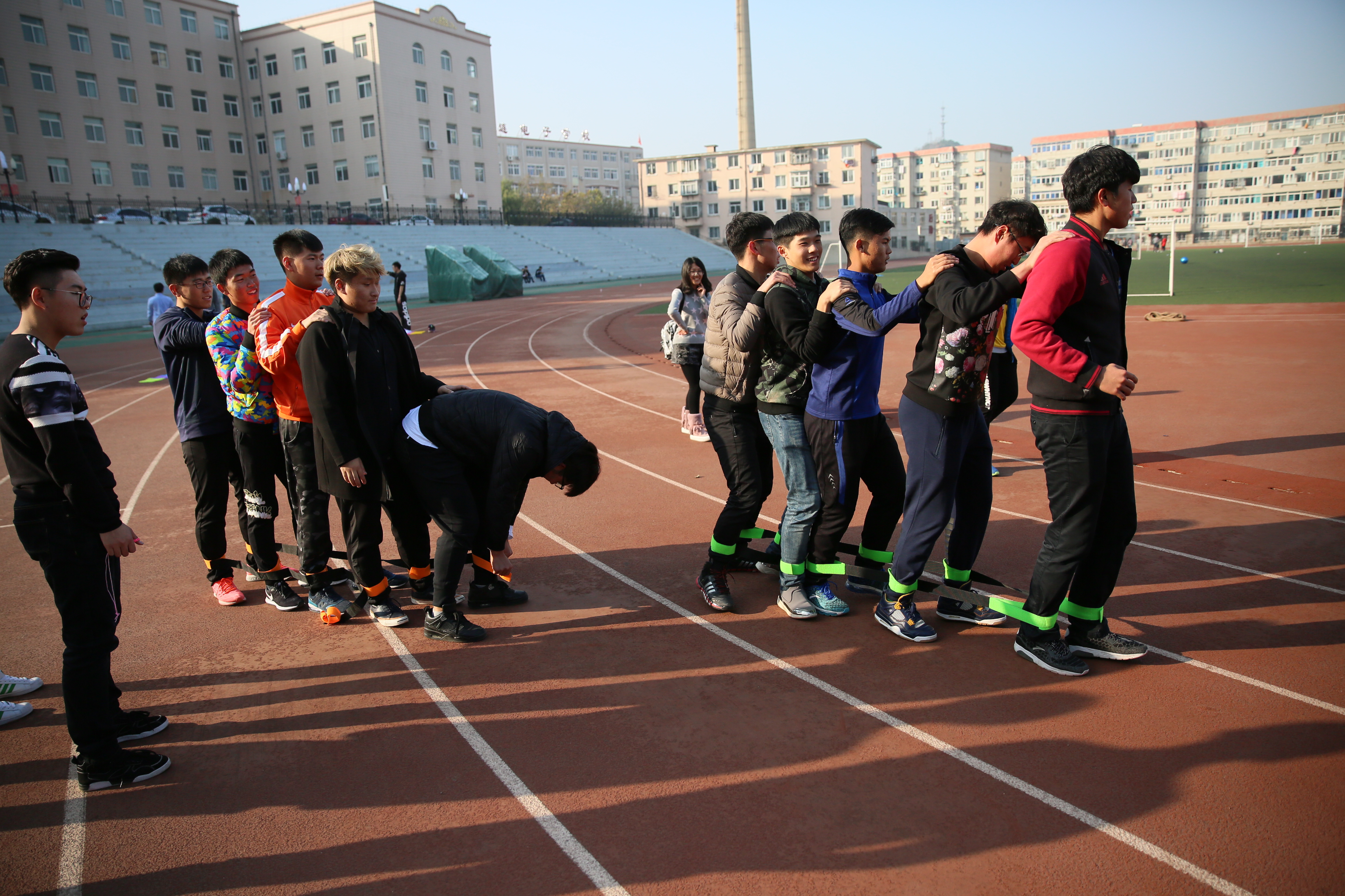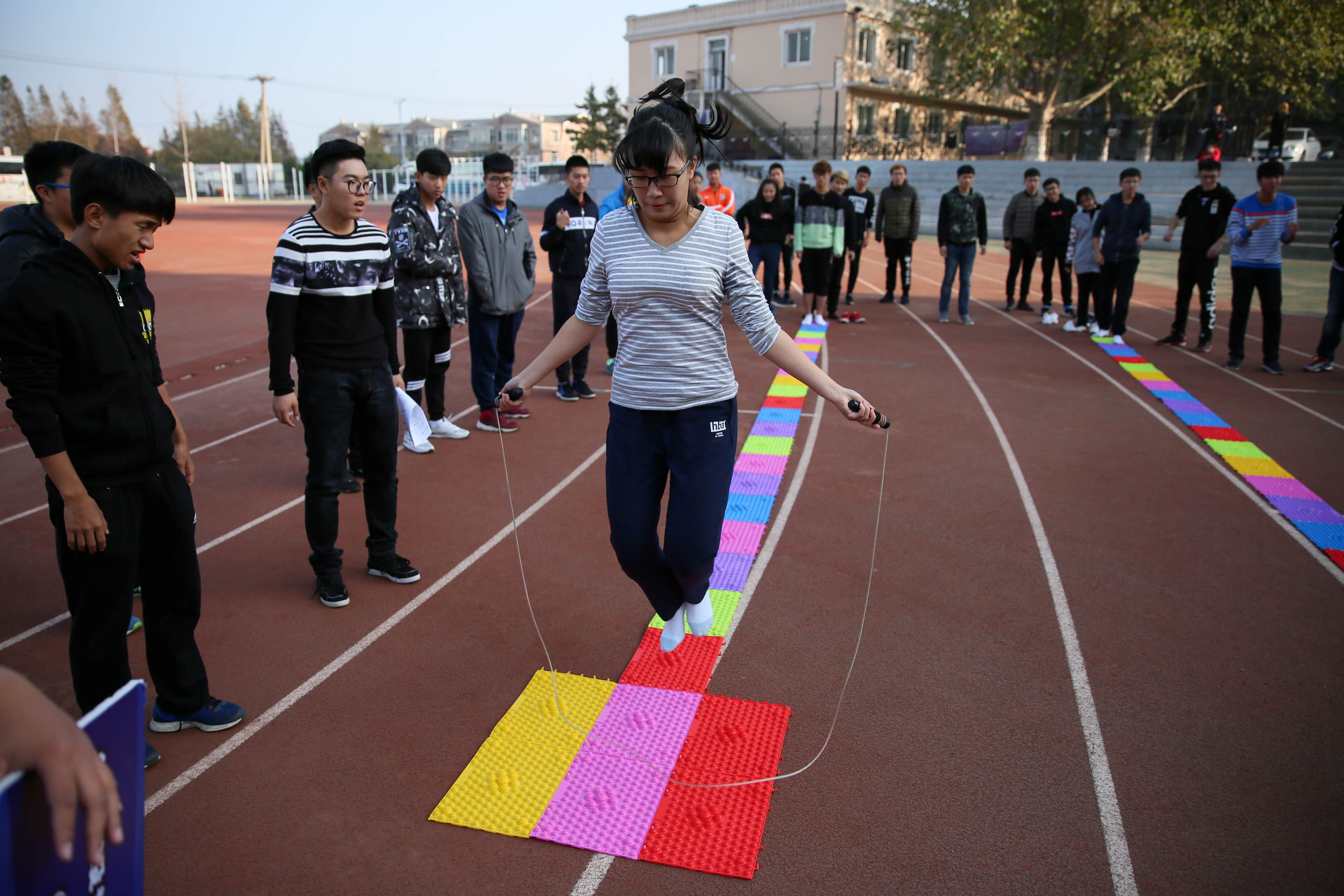 在最受期待的趾压板跳绳的比赛中,同学们忍着脚下的疼痛,拼命向前跑,到达指定位置后跳绳,十个人通过接力的方式完成比赛。