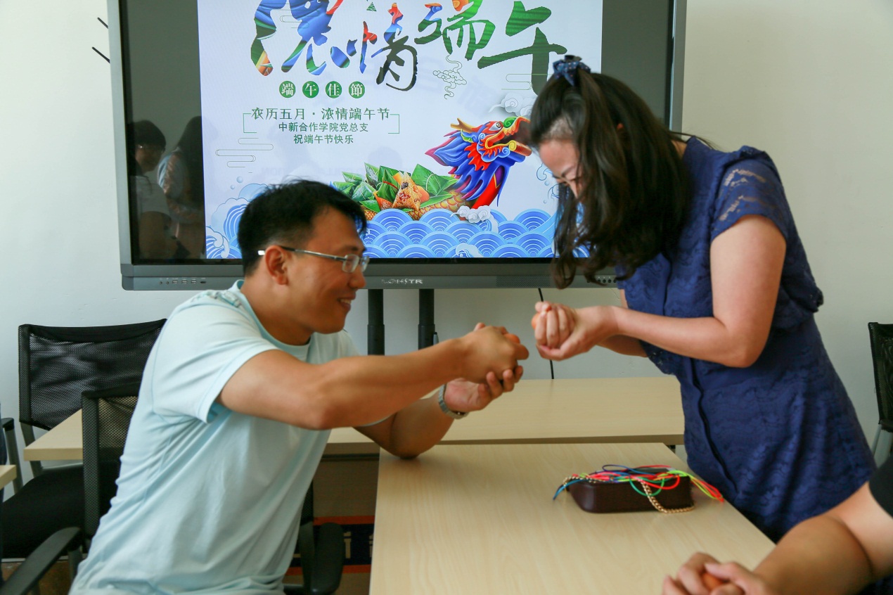 活动内容丰富多彩。“DIY五彩绳”活动激起了教职工们的学习制作热情,大家各显其能,编制花样繁多,纷纷为自己和家人献上节日的祝福。“顶鸡蛋”大赛掀起活动高潮,大家拿起自带的鸡蛋踊跃参赛,PK出了鸡蛋中的冠亚季军。活动的最后,大家一同观看了“经典诵读”——《离骚》配乐朗诵版视频,以此来纪念屈原。
