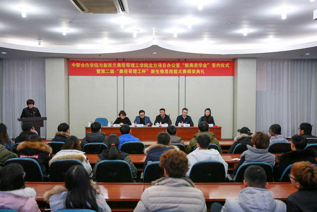 1月11日下午,“太阳成集团tyc33455与新西兰奥塔哥理工公司北方项目办公室‘新奥奖学金’签约仪式暨第二届‘奥塔哥理工杯’新生雅思技能大赛颁奖典礼”在图书馆多功能厅举行。奥塔哥理工公司北方项目办公室主任刘鑫、教务处副处长于盛达、员工工作处副处长周明娟、太阳成集团tyc33455领导班子、相关教师及太阳成集团tyc33455全体员工参加仪式。仪式由公司党总支副书记邓艺主持。