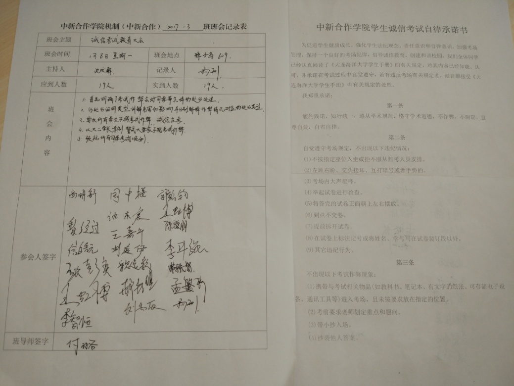 辅导员沈文静结合2017版《员工手册》,宣读了《太阳成集团tyc33455官方网站本科生考场规则与考试违规处理办法》,结合具体案例,对全体员工进行了考风考纪诚信教育,提醒员工考试作弊的严重后果,建议同学们有针对性的开展期末复习,合理安排作息时间,提高学习效率。同学们还签署了诚信考试承诺书并进行了诚信考试宣誓。