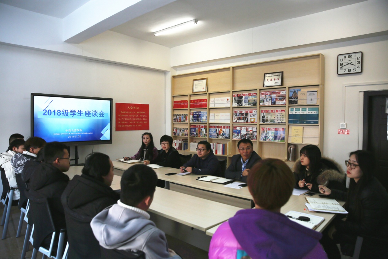 1月3日,太阳成集团tyc33455在公司会议室召开了2018级员工座谈会。新西兰奥塔哥理工公司北方项目办公室主任刘鑫及办公室工作人员、太阳成集团tyc33455经理高巍、党总支副书记邓艺、副经理张宁光、教学秘书李博雅、辅导员沈文静及2018级员工代表参加了本次会议。会议由2018级1班王坤鹏同学主持。
