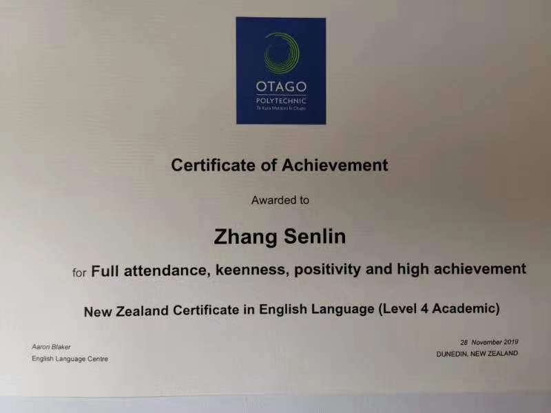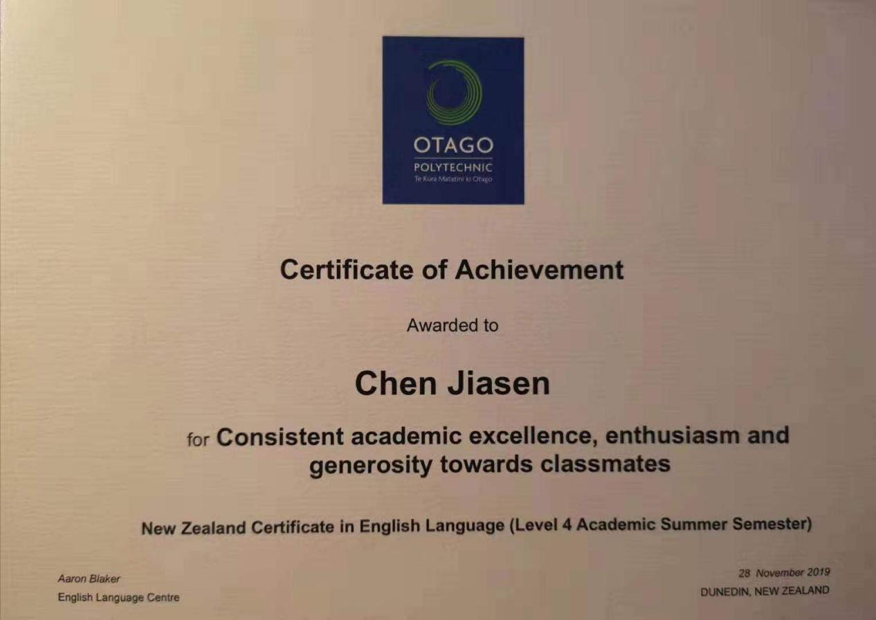 11月28日,在新西兰奥塔哥理工公司Level4语言课程结业典礼上,2016级陈嘉森,张森林两名同学被奥塔哥理工公司语言中心评为优秀毕业生,并颁发证书以资鼓励,此次仅两位中国员工获此殊荣。
