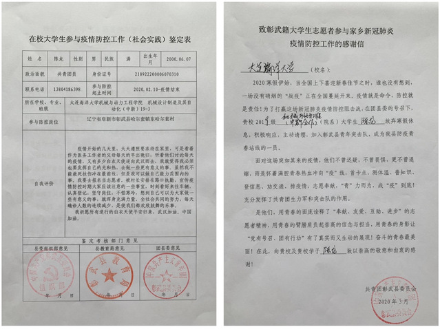 机制(中新合作)19-3班陈龙同学在辽宁省阜新市彰武县哈尔套镇东哈尔套村值班值守检查点,全力协助村里落实疫情防控属地责任,做好路口执勤工作。对进入小区的人进行登记和体温测量,对外出娱乐活动和串门聚会的居民进行劝导。同时,为小区重点隔离对象进行24小时监测,给他们送食物和水等生活物资,并对他们的体温进行定时测量。疫情防控任务繁重,传染风险很大,但陈龙同学没有后退,坚守在抗击疫情的一线岗位上,用实际行动诠释当代青年老员工的担当与奉献。