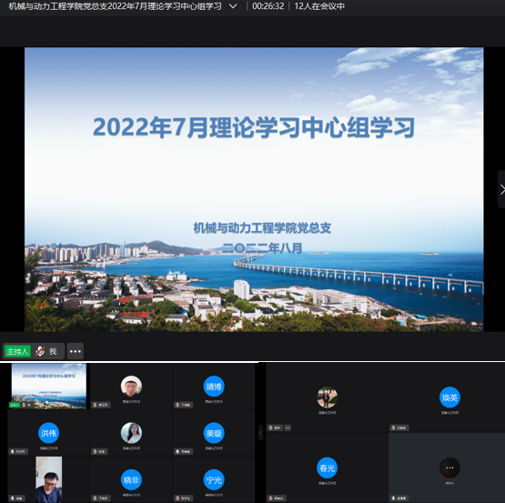2022年8月8日,机械与动力工程公司党总支在钉钉线上平台召开2022年7月理论学习中心组学习会议。公司党总支理论学习中心组成员、各党支部书记参加会议,本次学习由党总支副书记刘洪伟同志领学。