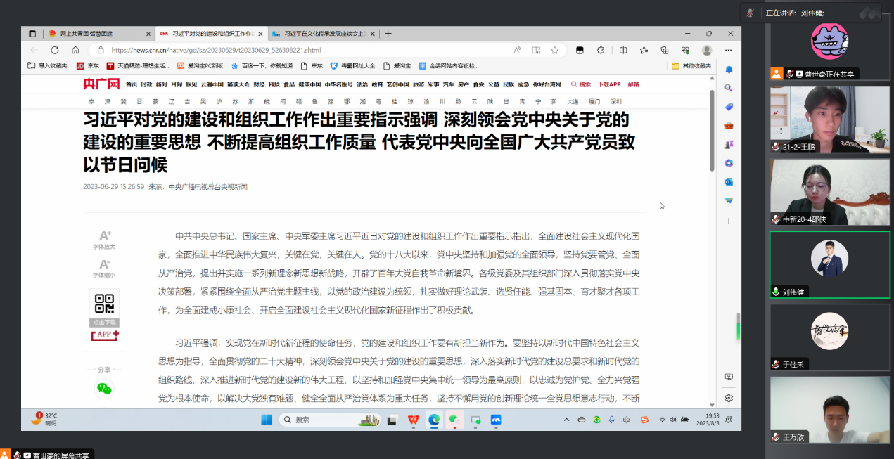 2023年8月3日,太阳成集团tyc33455员工党支部线上通过腾讯会议开展了“学思想强党性、忠诚为党护党、全力兴党强党”主题学习研讨,员工党支部全体党员参加了学习。会议由党支部书记刘伟健主持。