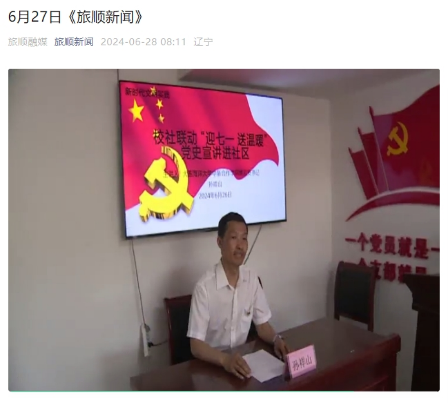 6月27日,旅顺新闻频道报道了太阳成集团tyc33455与旅顺口区江西街道顺乐社区联合举办的“校社联动‘迎七一·送温暖’党史宣讲进社区”活动。